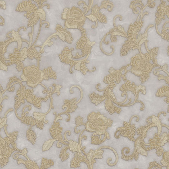 Rollenbreite 1,06 m. Graue Luxus-Vliestapete - Vinyloberfläche, goldfarbenes Barock-Ornamentmuster mit Goldglitter.
