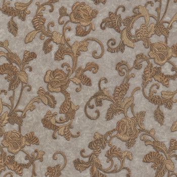 Rollenbreite 1,06 m. Braune halbglänzende Luxus-Vliestapete - Vinyloberfläche, markantes goldenes barockes Ornamentmuster.