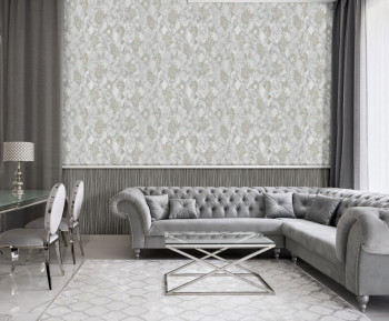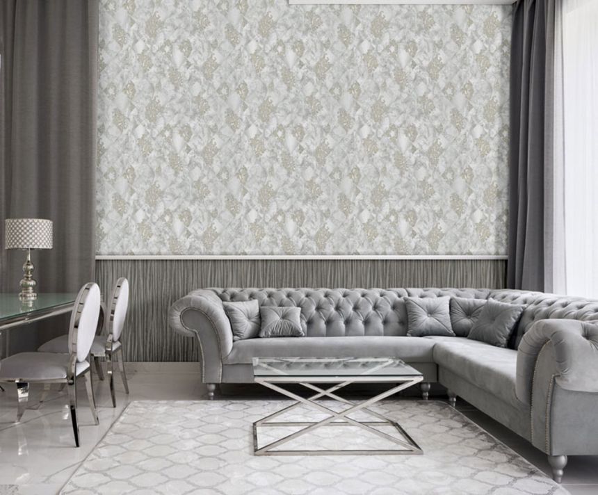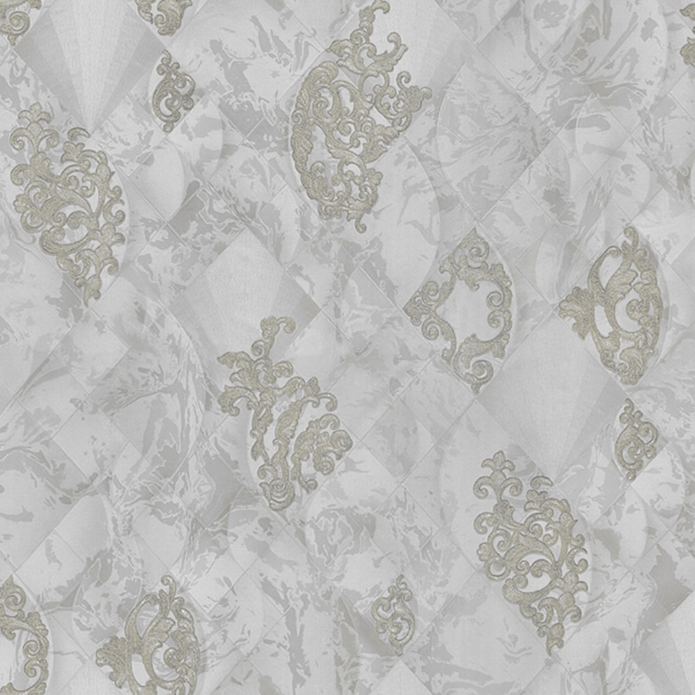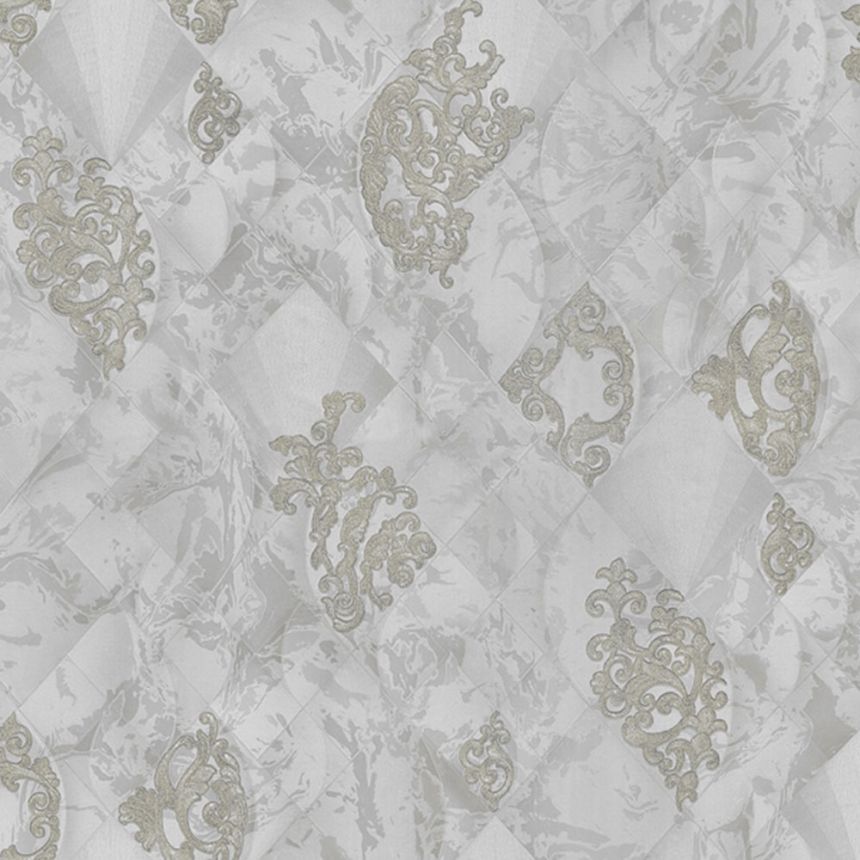 Rollenbreite 1,06 m. Graue Luxus-Vliestapete - Vinyloberfläche, geometrisch marmorierter Hintergrund, barockes Ornamentmuster mit silbernem Glitzer.
