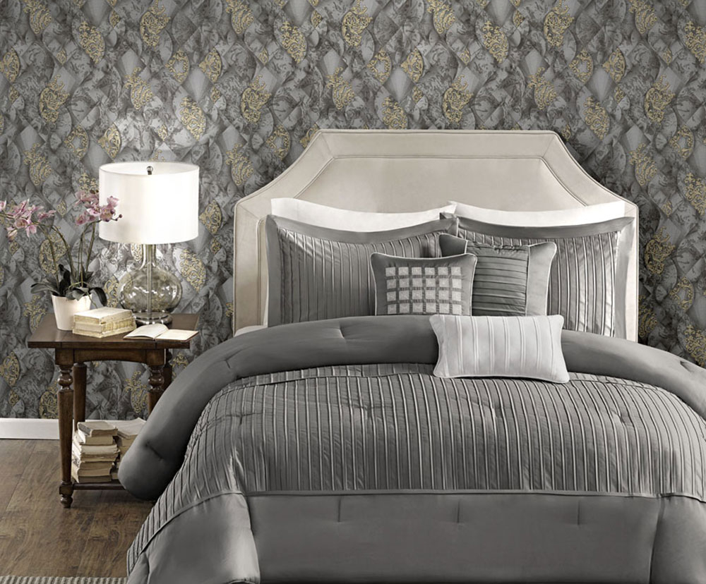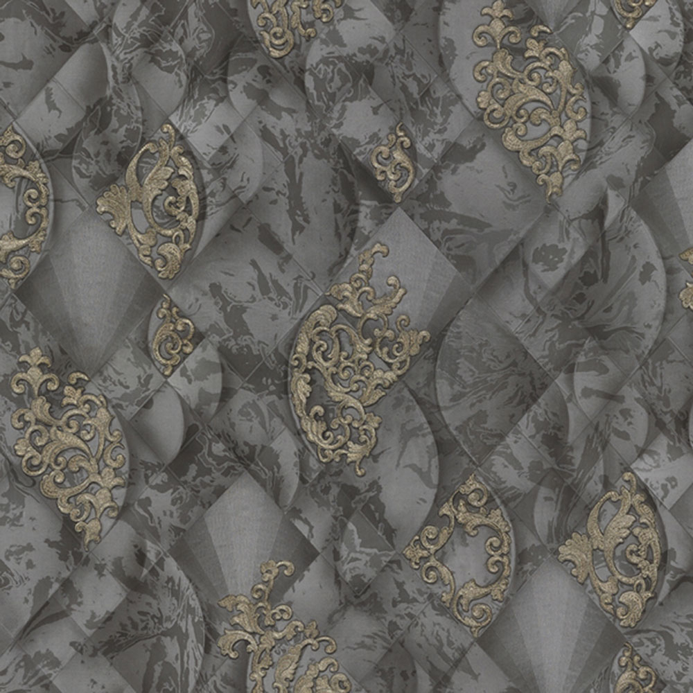 Rollenbreite 1,06 m. Grau-schwarze Luxus-Vliestapete - Vinyloberfläche, geometrisch marmorierter Hintergrund, barockes Ornamentmuster mit Goldglitter.