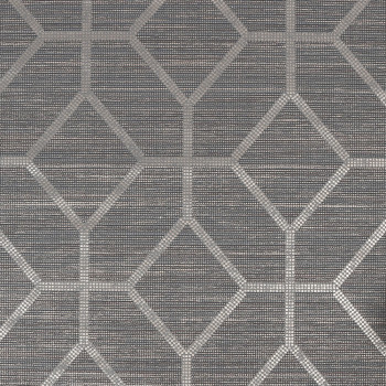 Luxustapete dunkelgrau mit geometrischem Kupfermuster auf einer strukturierten Oberfläche, die grobe Textilien imitiert.