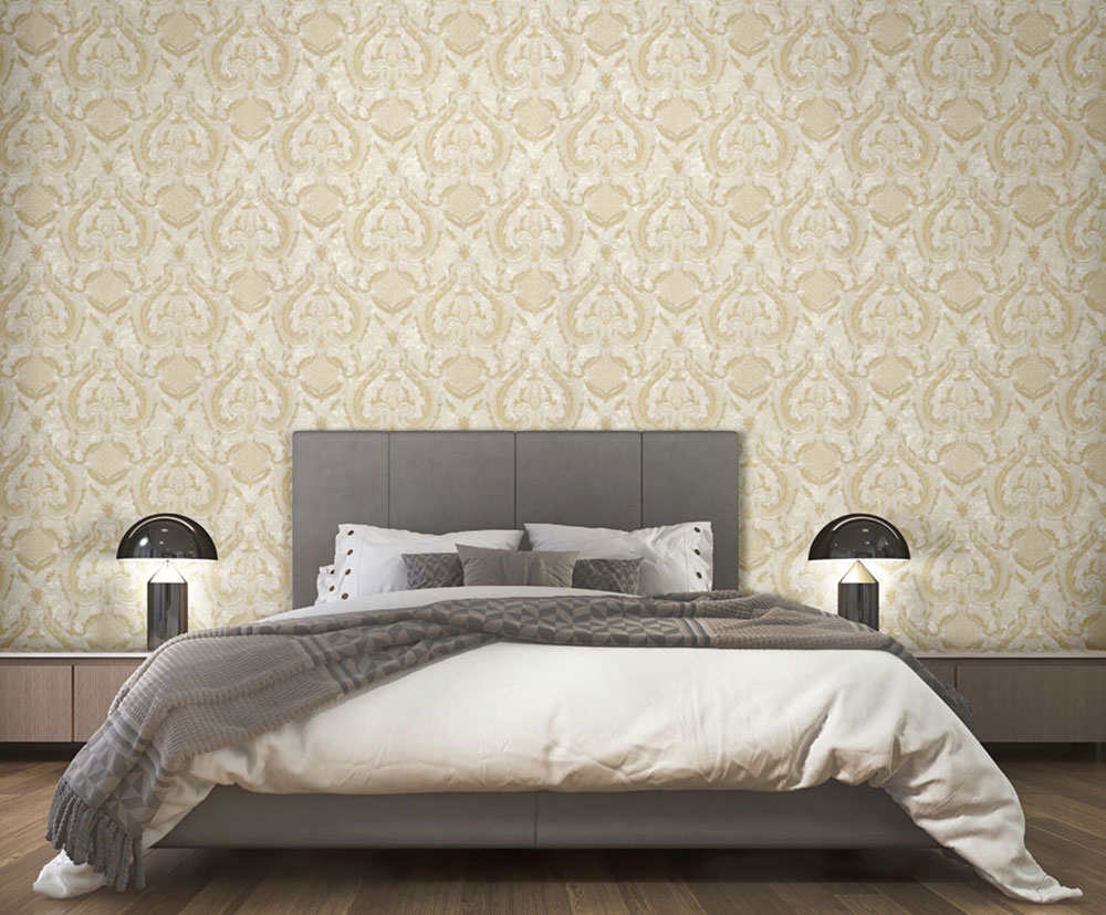 Rollenbreite 1,06 m. Goldbeige Luxus-Vliestapete - halbglänzende beigefarbene Vinyloberfläche, markantes goldenes Barock-Ornamentmuster mit Goldglitter.