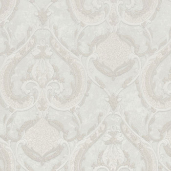 Rollenbreite 1,06 m. Luxus-Vliestapete - Vinyloberfläche, cremefarbener halbglänzender Hintergrund, markantes barockes Ornamentmuster mit silbernem Glitzer.