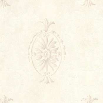 Luxuriöse Vliestapete mit barocken Blumen- und Vasenornamenten auf einem rauen hellbeigen Stuckhintergrund.