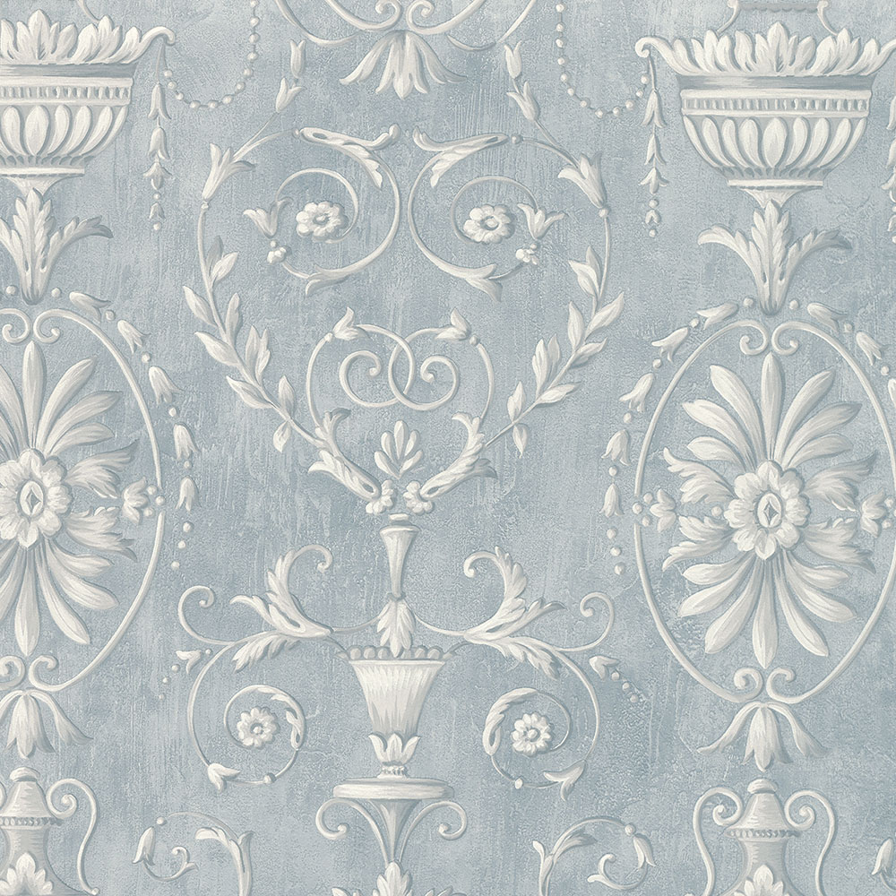 Luxuriöse Vliestapete mit barocken Blumen- und Vasenornamenten auf einem rauen graublauen Stuckhintergrund.