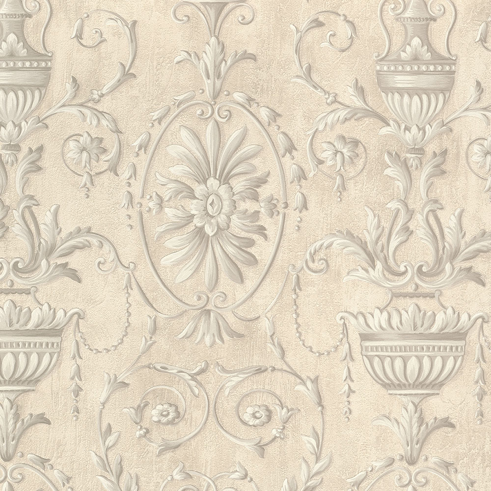 Luxuriöse Vliestapete mit barocken Blumen- und Vasenornamenten auf einem rauen beigen Stuckhintergrund.