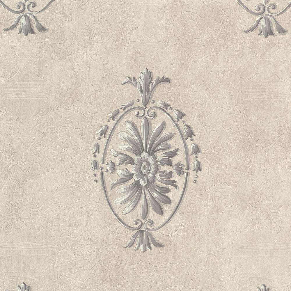 Luxuriöse Vliestapete mit barocken Blumen- und Vasenornamenten auf einem rauen beigen Stuckhintergrund.
