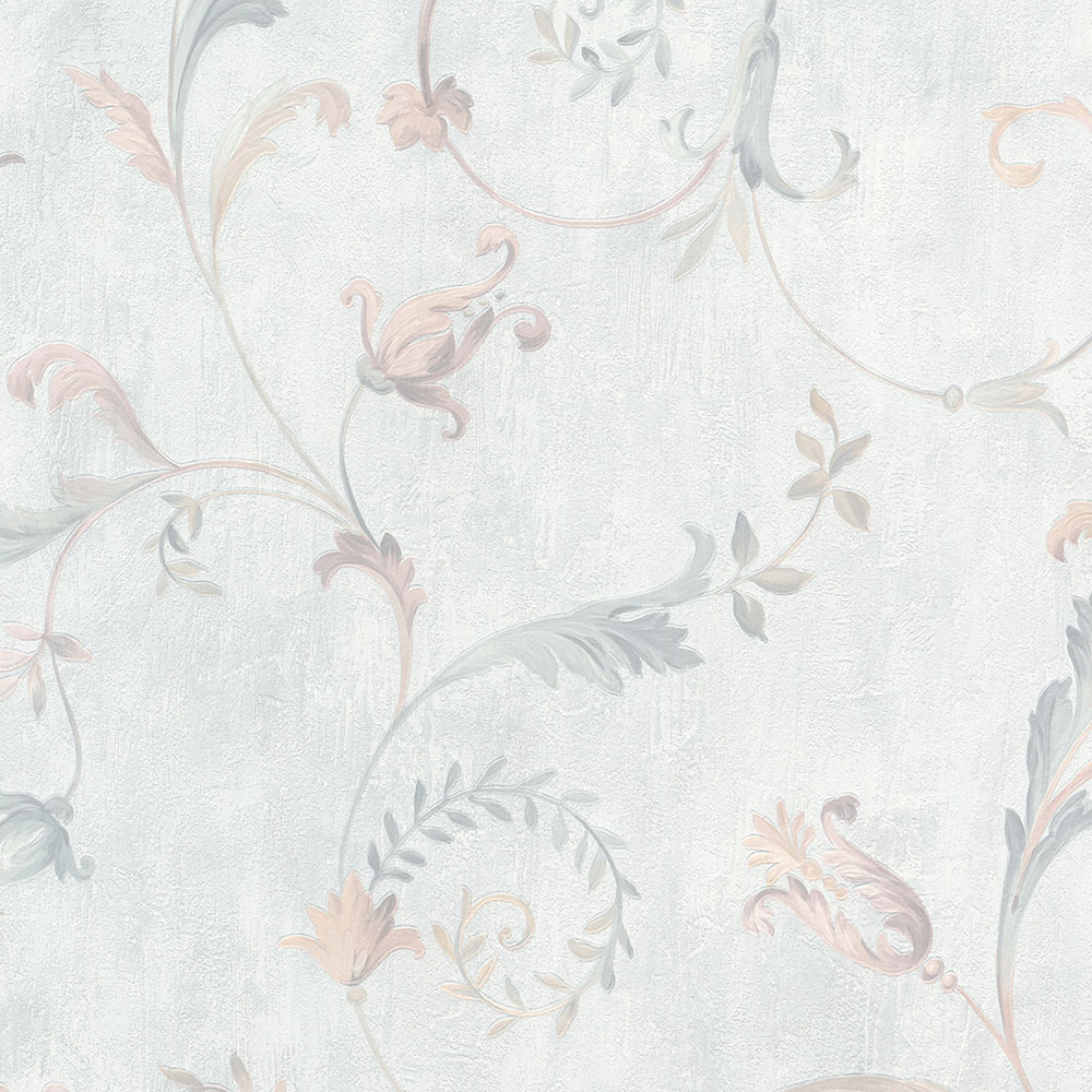 Luxus-Vliestapete mit floralen Ornamenten auf einem feinen Stuckhintergrund in Hellgrau.