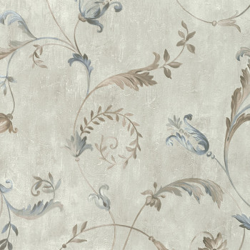 Luxus-Vliestapete mit floralen Ornamenten auf einem feinen Stuckhintergrund in Hellgrau.