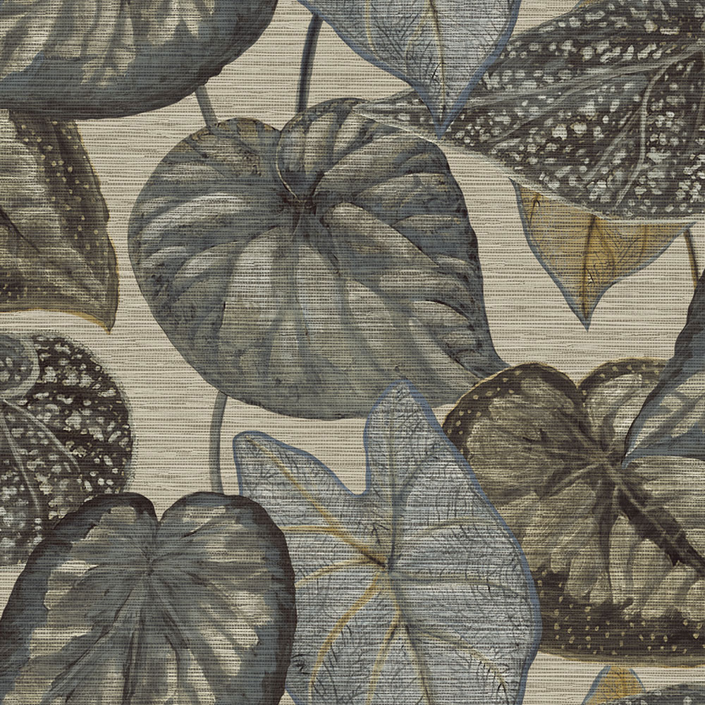 Tapete mit einem Motiv aus großen grauen und blauen Blättern auf beigem Hintergrund mit Textilstruktur.