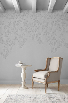 Fototapete mit grauen Zweigen mit Blättern auf einem grauen, glatten Hintergrund bringt eine angenehme Atmosphäre in den Innenraum.