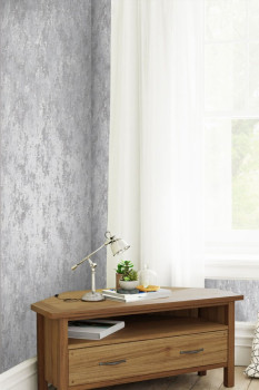 Vliestapete mit grauen und weißen Streifen auf einem hellgrauen, metallisch glatten Hintergrund bringt eine angenehme Atmosphäre in den Innenraum.