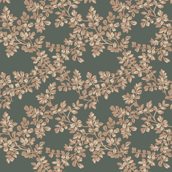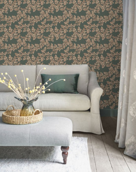 Vliestapete mit braun-beigen Blumen auf einem dunkelgrünen, glatten Hintergrund bringt eine angenehme Atmosphäre in den Innenraum.