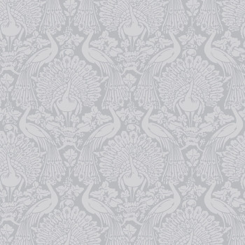 Metallische Tapete mit Pfauen auf einem grauen, glatten Hintergrund bringt eine angenehme Atmosphäre in den Innenraum.