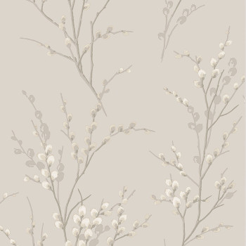 Wolltapete mit Katzenzweigen auf einem hellgrauen, glatten Hintergrund bringt eine angenehme Atmosphäre in den Raum.