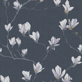 Romantische Wolltapete mit Magnolienblüten in hellen Grau- und Weißtönen auf einem glatten blauen Hintergrund bringt eine angenehme Atmosphäre in den Raum.