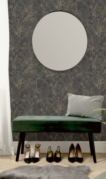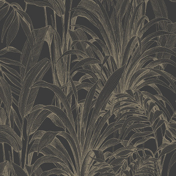 Vliestapete mit goldenen Umrissen von Pflanzenblättern auf einem schwarzen, strukturierten Hintergrund.