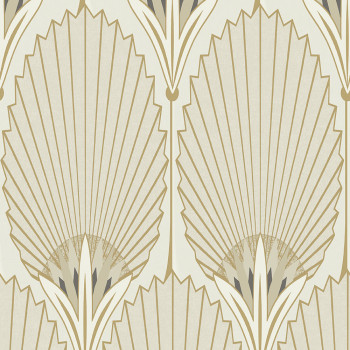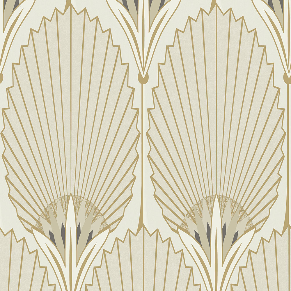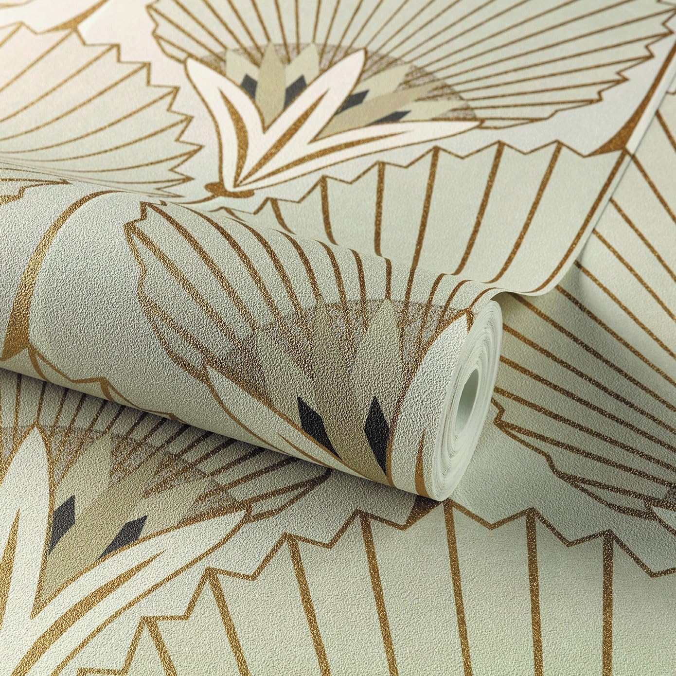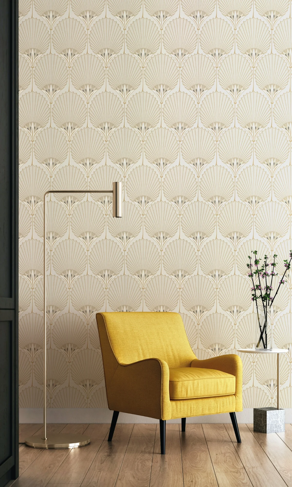 Vliestapete mit goldenen geometrischen Mustern auf einem strukturierten cremefarbenen Hintergrund bringt eine angenehme, luxuriöse Atmosphäre in den Raum.