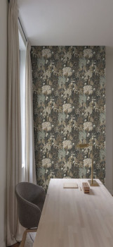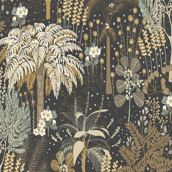 Vliestapete mit einem Motiv von Palmen und tropischen Bäumen in Beige- und Brauntönen auf schwarzem Hintergrund mit Metallic-Reflexen.