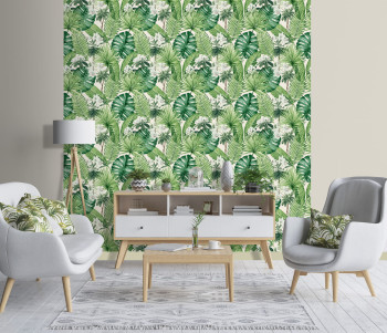 Vliestapete mit grünen Blättern auf weißem Hintergrund.