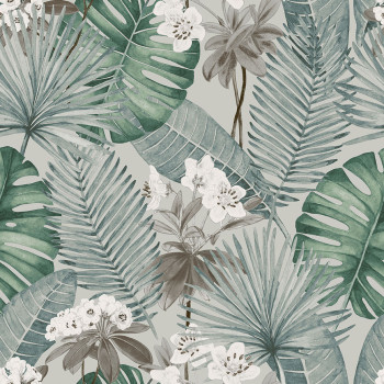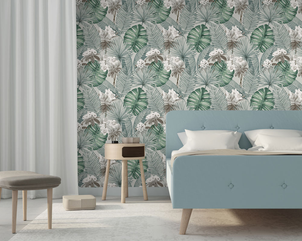 Vliestapete mit hellgrünen Blättern auf grauem Hintergrund.