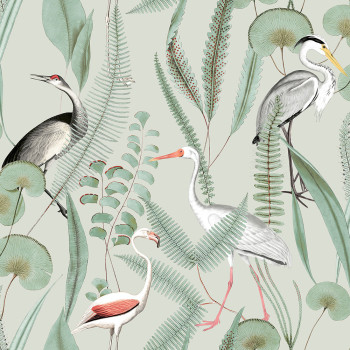 Vliestapete mit Flamingos und Reihern auf einem hellblauen, fein strukturierten Hintergrund.