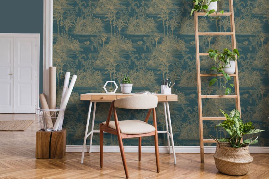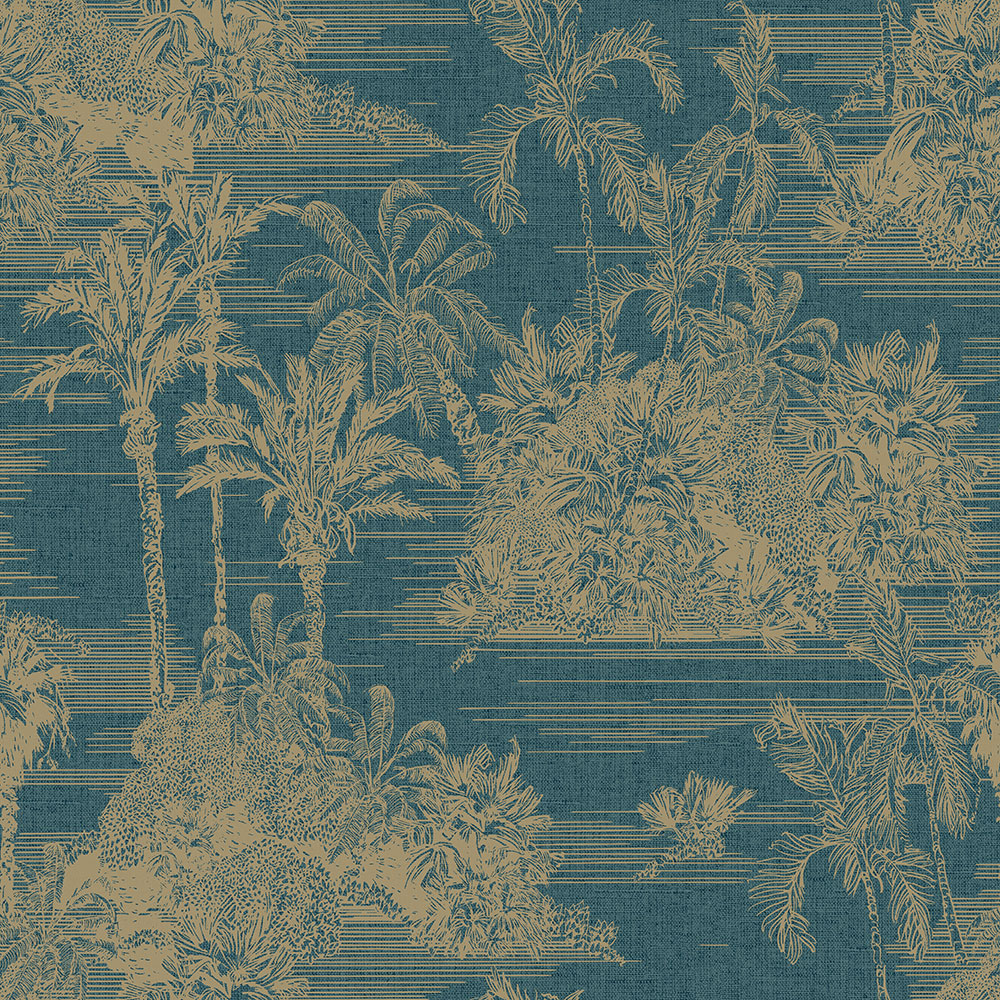 Vliestapete mit goldenen Umrissen von Palmen auf einem dunkelblauen, strukturierten Hintergrund.