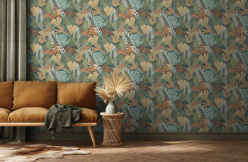 Vliestapete mit bunten Blättern auf dunkelgrünem Hintergrund.