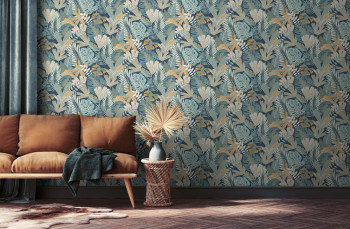 Vliestapete mit bunten Blättern auf dunkelblauem Hintergrund.