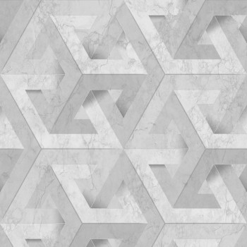 Hellgraue Vliestapete, Marmorimitat mit einem markanten geometrischen Muster mit silbernen Linien.