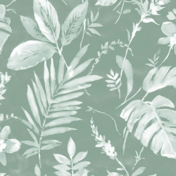 Vliestapete mit weißen Blättern auf grünem Hintergrund.