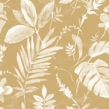 Vliestapete mit cremefarbenen Blättern auf ockerfarbenem, strukturiertem Hintergrund.