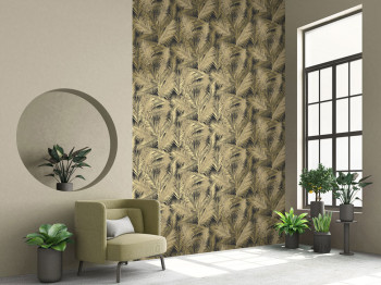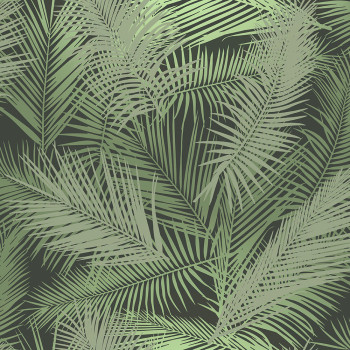 Vliestapete mit grünen Palmenblättern auf dunkelgrünem, strukturiertem Hintergrund.