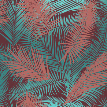 Vliestapete mit burgunderroten, türkisfarbenen und metallischen Palmenblättern auf einem strukturierten Hintergrund.