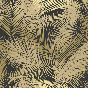Vliestapete mit goldenen Palmenblättern auf schwarzem, strukturiertem Hintergrund.