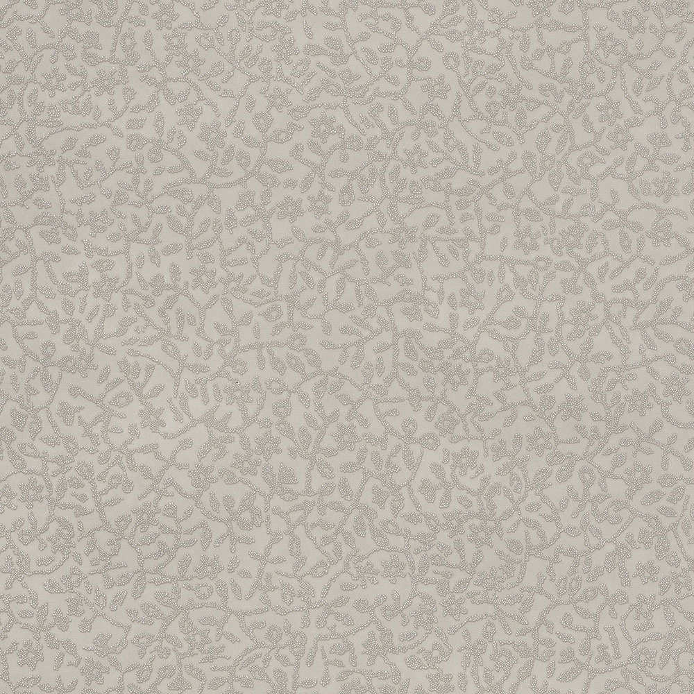 Design eines zart geprägten, floralen Motivs aus winzigen Pünktchen. Hintergrund matt hellgrau-beige, Muster grau-beige, Punkte natur. Eine Kollektion, die von den Werken der kühnen, unabhängigen und stilvollen Frida Kahlo inspiriert ist.