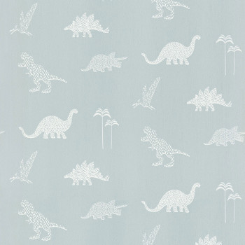 Grau-grüne Kinder-Vliestapete mit Dinosauriern.