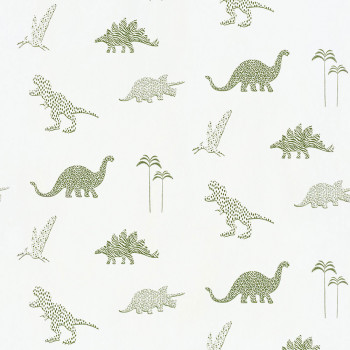Cremefarbene Kindervliestapete mit grünen Dinosauriern.