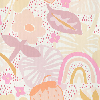 Bunte Kindervliestapete - Kindermalerei, Blumen, Blätter, Erdbeeren, Regenbogen. Die Tapete hat eine Stoffstruktur.
