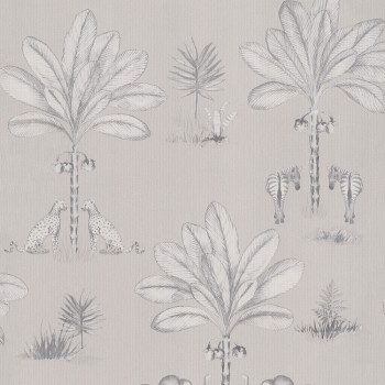 Grau-beige Vliestapete für Kinderzimmer - Kindertapete - Elefanten, Zebras, Leoparden, Palmen.