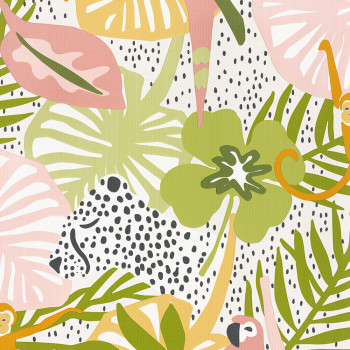 Bunte Kindertapete - Blätter, Affen und Papageien. Die Tapete hat eine Stoffstruktur.