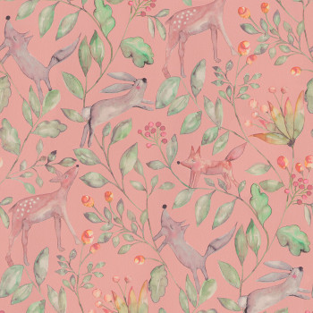 Rosa Vliestapete für Kinderzimmer - Tapete Waldtiere.