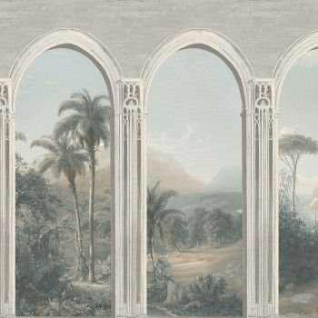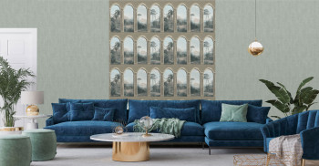Vliestapete mit Vinyloberfläche in Grau- und Grüntönen mit dezenten Reflexen und einem Arkadenmuster mit Landschaft. Rollengröße: 1,06 x 10,05 m.