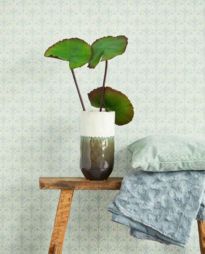 Matte, glatte Vliestapete mit ornamentalem Muster in Türkis- und Graublautönen. Eine Kollektion, die von den Werken der kühnen, unabhängigen und stilvollen Frida Kahlo inspiriert ist.