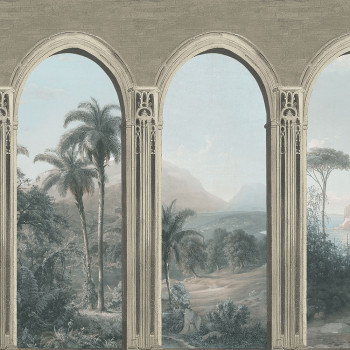 Vliestapete mit Vinyloberfläche in Grau- und Grüntönen mit dezenten Reflexen und einem Arkadenmuster mit Landschaft. Rollengröße: 1,06 x 10,05 m.