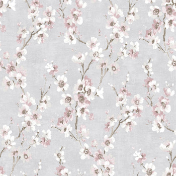 Vliestapete mit Vinyloberfläche in Grau- und Rosatönen mit floralem Muster.