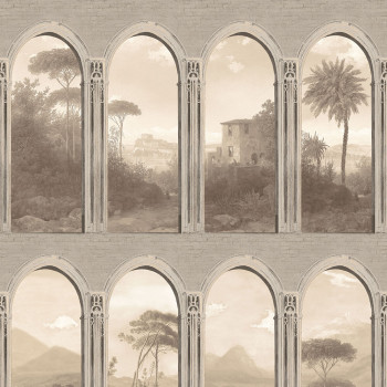 Vliestapete mit Vinyloberfläche in Beigetönen mit dezenten Reflexen und einem Arkadenmuster mit Landschaft.