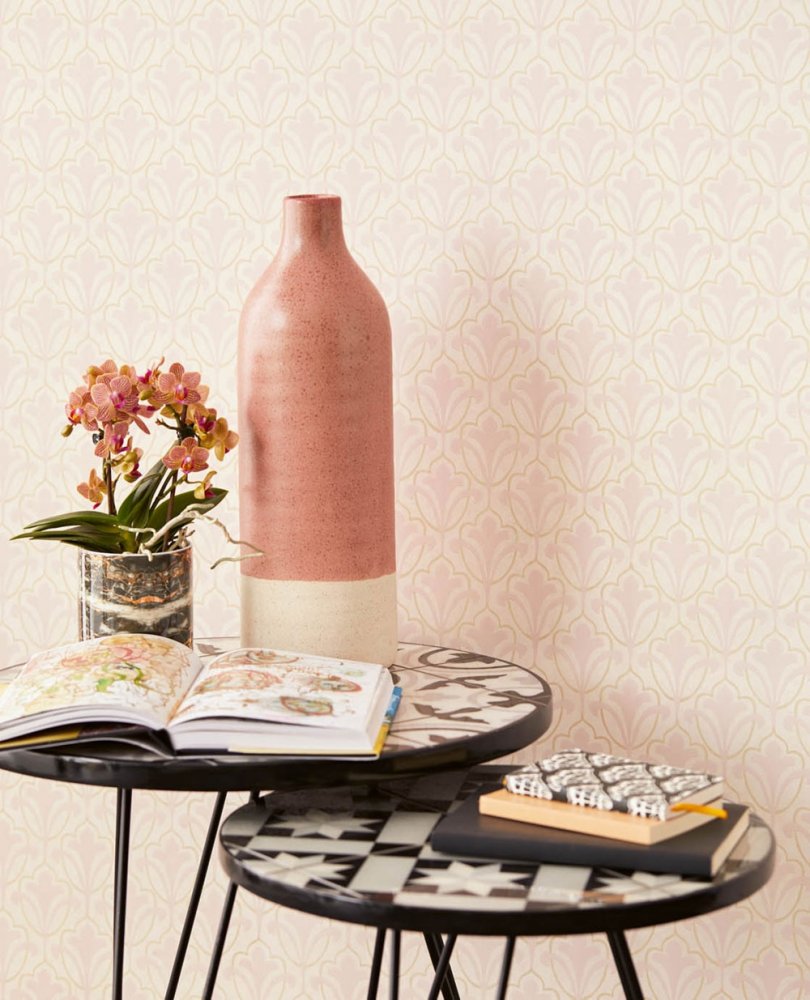 Matte, glatte Vliestapete mit ornamentalem Muster in Rosa- und Beigetönen. Eine Kollektion, die von den Werken der kühnen, unabhängigen und stilvollen Frida Kahlo inspiriert ist.