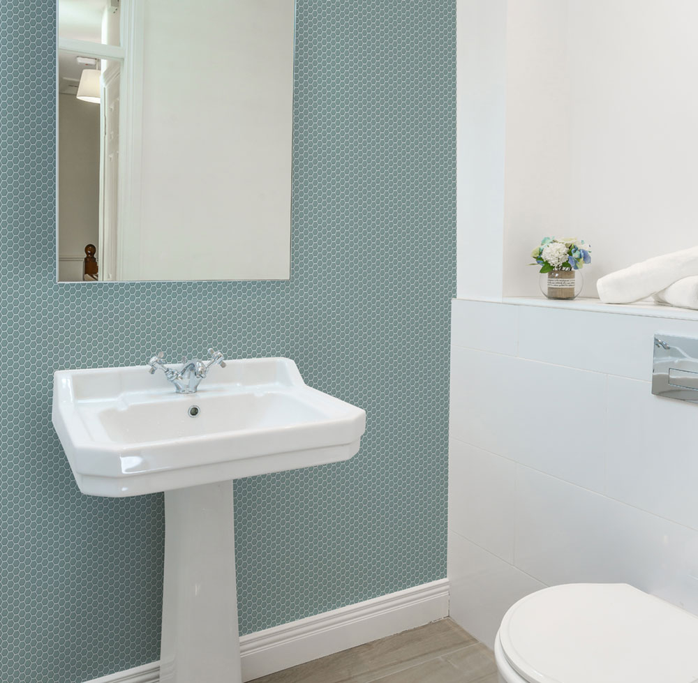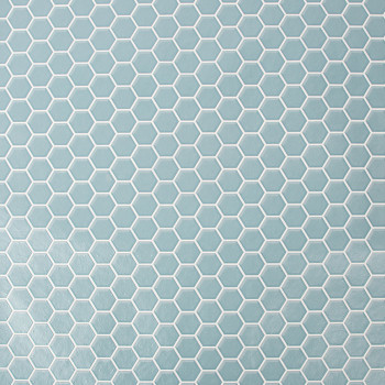Badezimmer- und Küchentapete mit Vinyloberfläche in hellblauer Farbe mit Sechsecken. Sechseckgröße ca. 3cm.