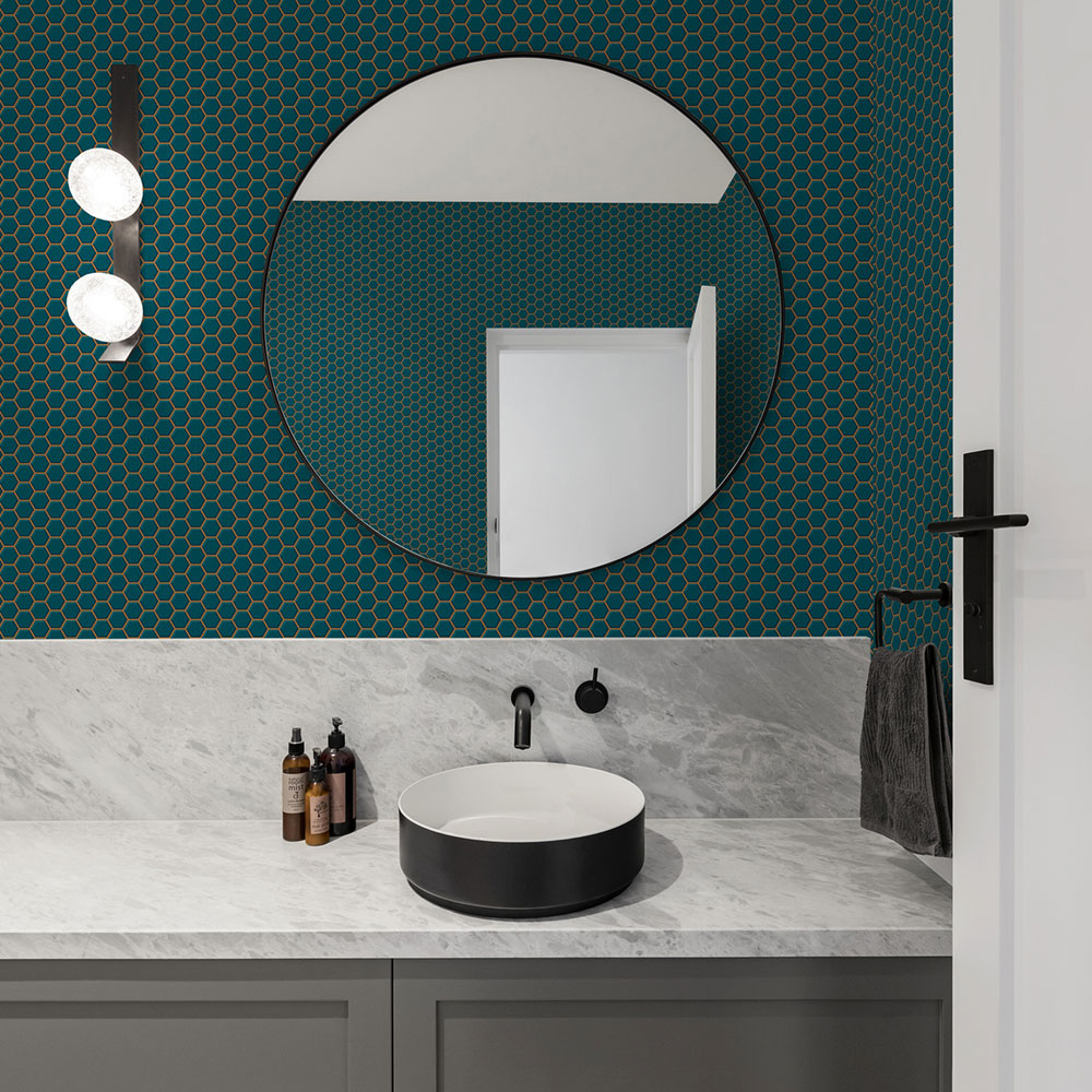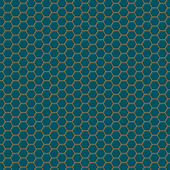 Bad- und Küchentapete mit Vinyloberfläche in Azurblau mit goldenen Sechseckkonturen. Sechseckgröße ca. 3cm.